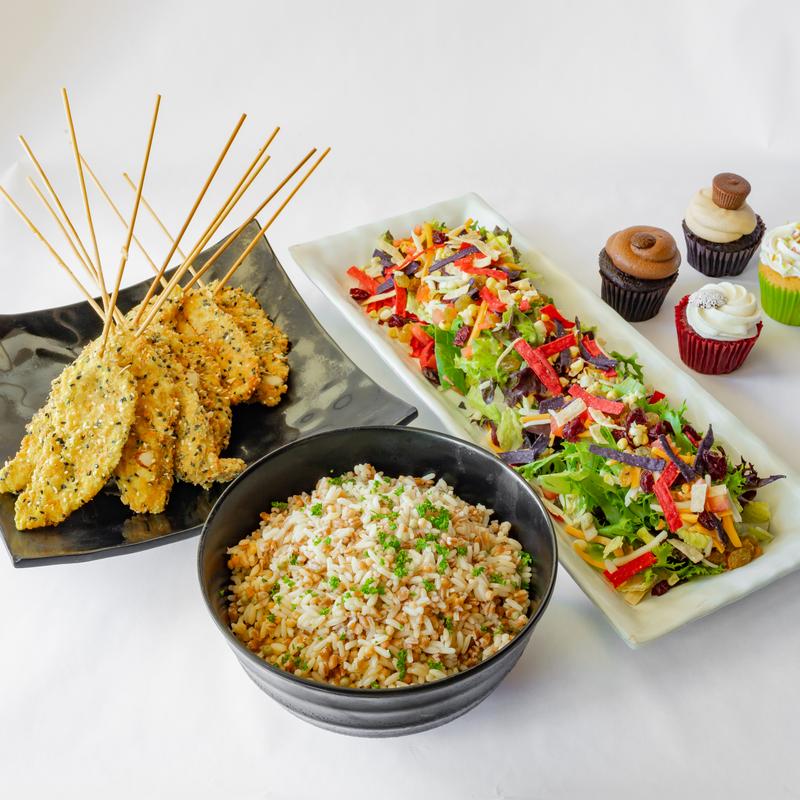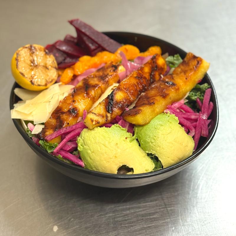 All quinoa rice bowls are served with a base of rice and quinoa blend, a base vegetable mixture of broccoli, sweet potato, and roasted red pepper.